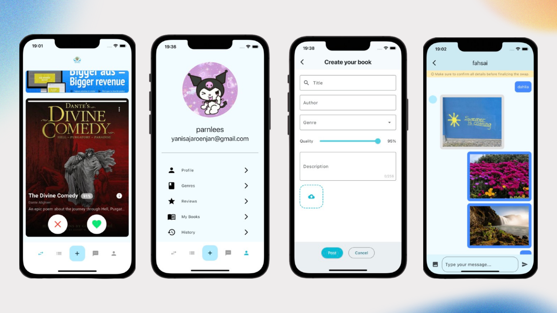 A mobile application developed as a senior project, designed to enable users to swap and chat about secondhand books within a community platform. The project focused on delivering a smooth and engaging user experience for matching and communicating with book-swapping partners.